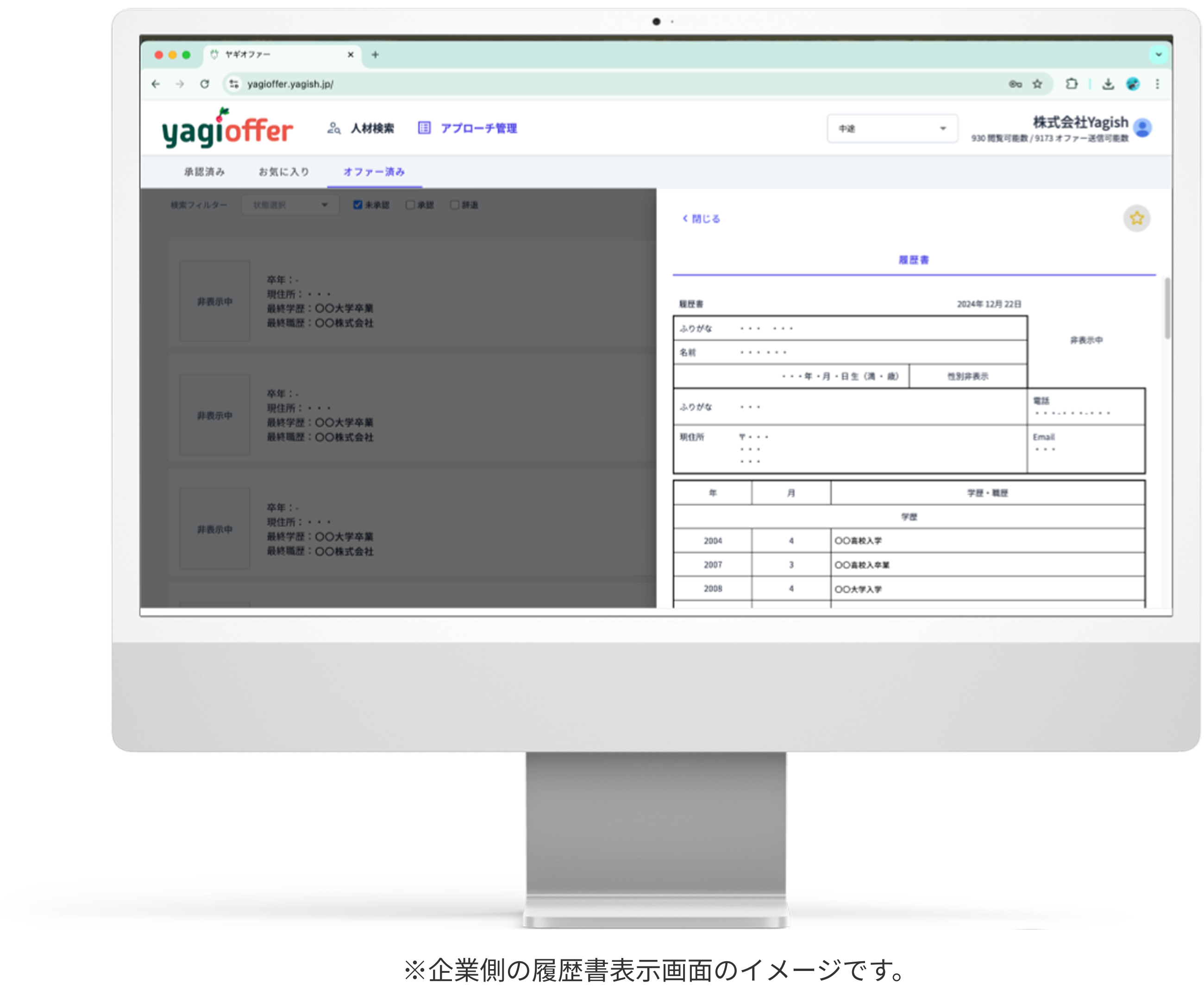 yagiofferとは、yagish(履歴書作成サービス)で作成された履歴書を使用したマッチングサービスです。